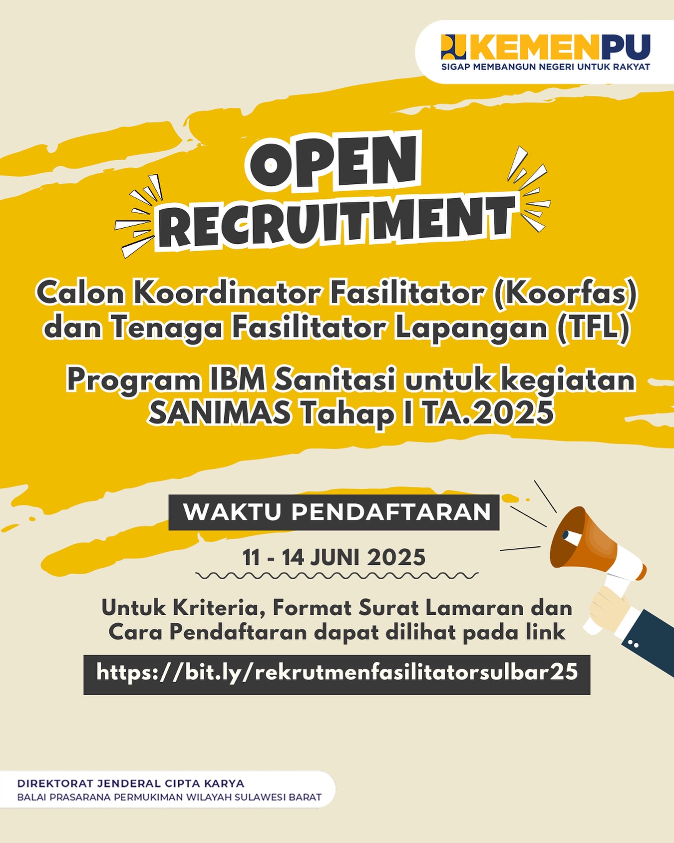 CENGOS.IN – Rekrutmen Calon Koordinator Fasilitator (Koorfas) dan Tenaga Fasilitator Lapangan (TFL) Program IBM Sanitasi untuk Kegiatan SANIMAS Tahap I BPPW Sulawesi Barat TA. 2025.