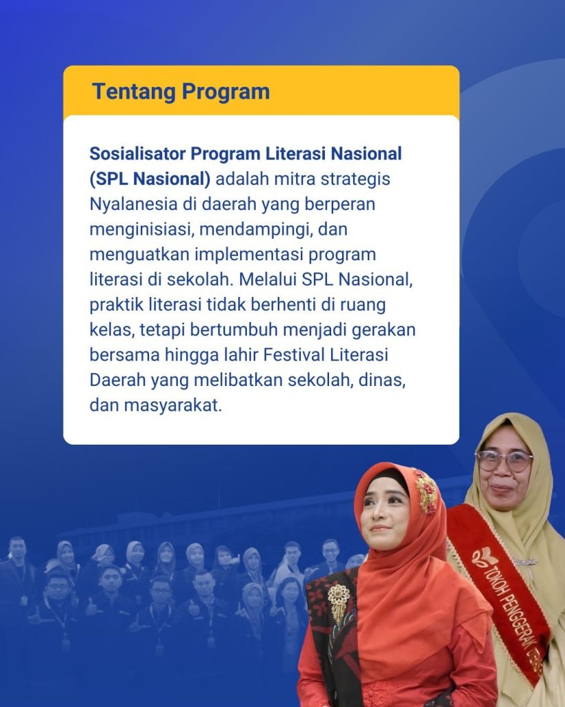 Sosialisator Program Literasi Nasional (SPL Nasional) adalah ujung tombak gerakan literasi di daerah. Posisi ini merupakan mitra strategis Nyalanesia yang berperan penting untuk: