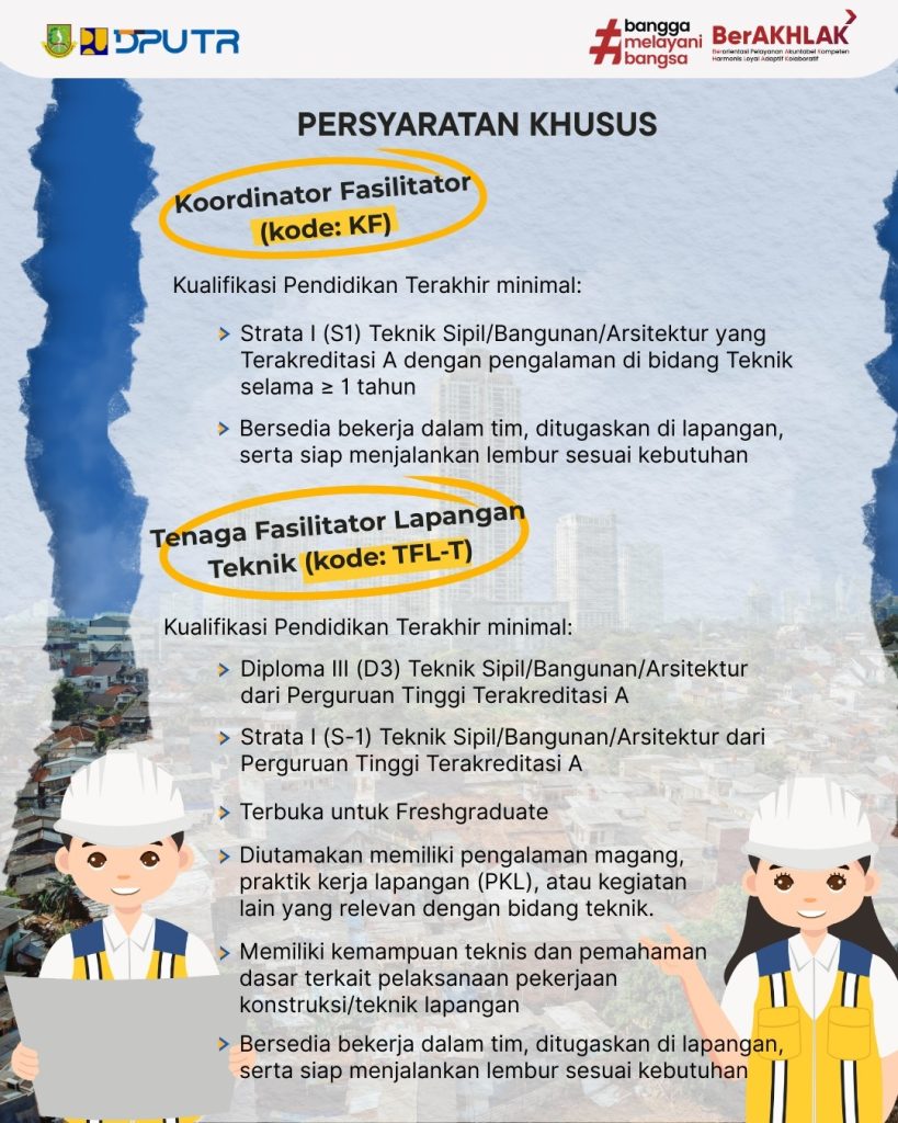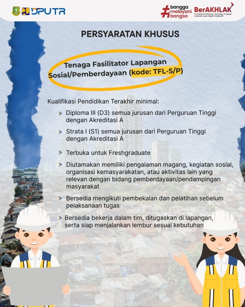Tenaga Fasilitator Lapangan Sosial/Pemberdayaan (kode: TFL-S/P)• Minimal pendidikan Diploma III (D3) atau Strata I (S1) semua jurusan dari Perguruan Tinggi dengan Akreditasi A.