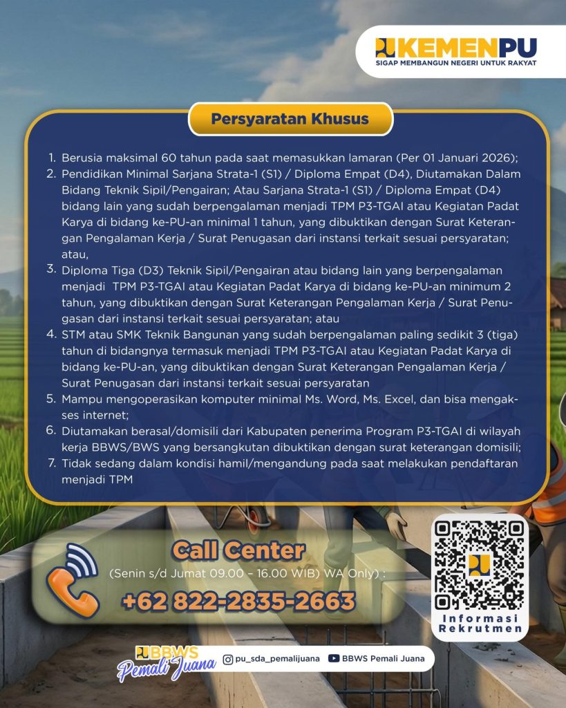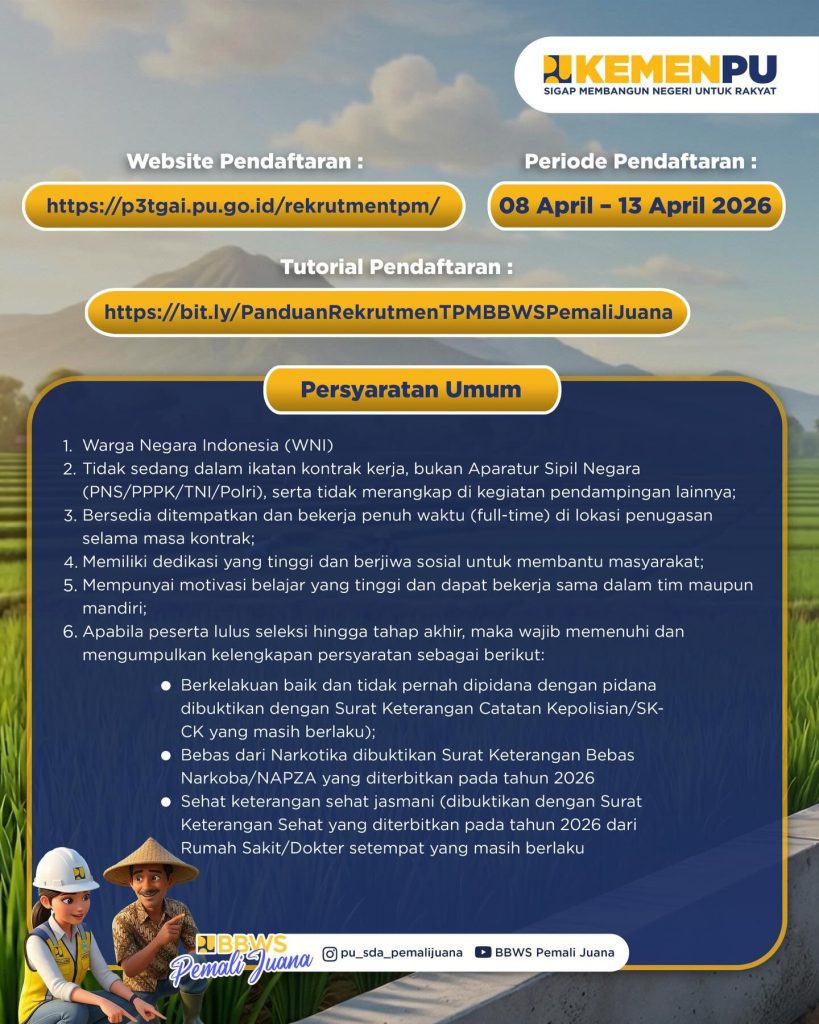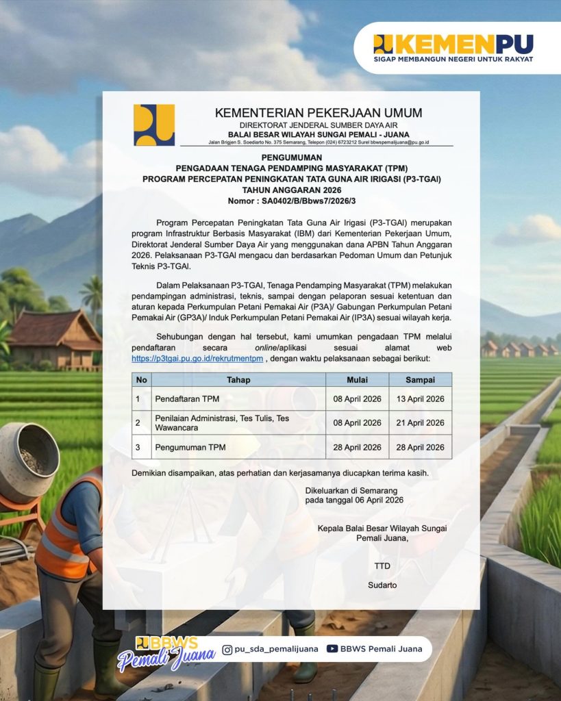 CENGOS.IN – Kementerian Pekerjaan Umum melalui BBWS Pemali Juana membuka kesempatan bagi putra-putri terbaik bangsa untuk bergabung sebagai Tenaga Pendamping Masyarakat (TPM) dalam mendukung program P3-TGAI.