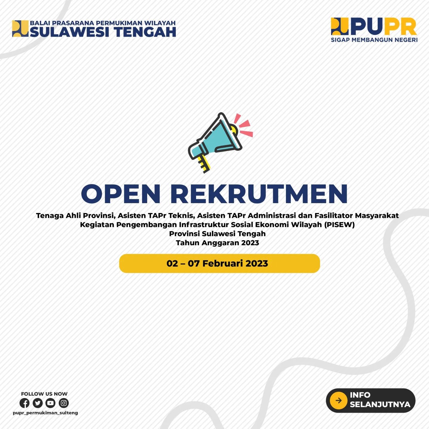 Rekrutmen Tenaga Pendamping TA Provinsi, Asisten TAPr Teknis, Asisten TAPr Administrasi dan Fasilitator Masyarakat Kegiatan PISEW Provinsi Sulawesi Tengah TA 2023